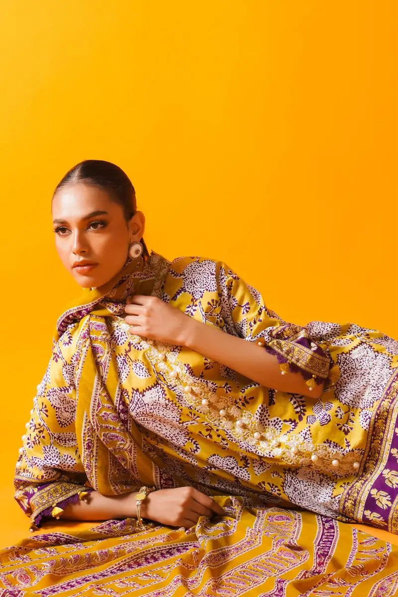 A harmony of floral blooms, drawn from the lush beauty of nature, comes to life on an airy lawn canvas. Adding to the allure is a graceful chiffon dupatta adorned with delicate patterns to create a botanical dreamscape.