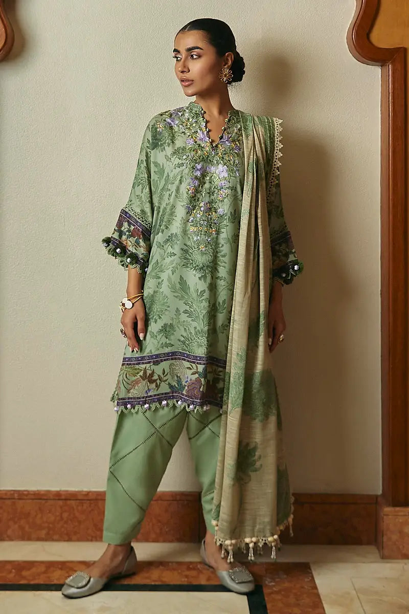 In the ethereal shade of georgia fern, this digital-printed linen ensemble weaves chrysanthemum flowers into a tapestry of grace, as delicate embroidery motifs rain down like a gentle shower of blooms. Paired harmoniously with cotton-dyed pants and a printed khaddar dupatta, it's an ode to the beauty found in nature's embrace.