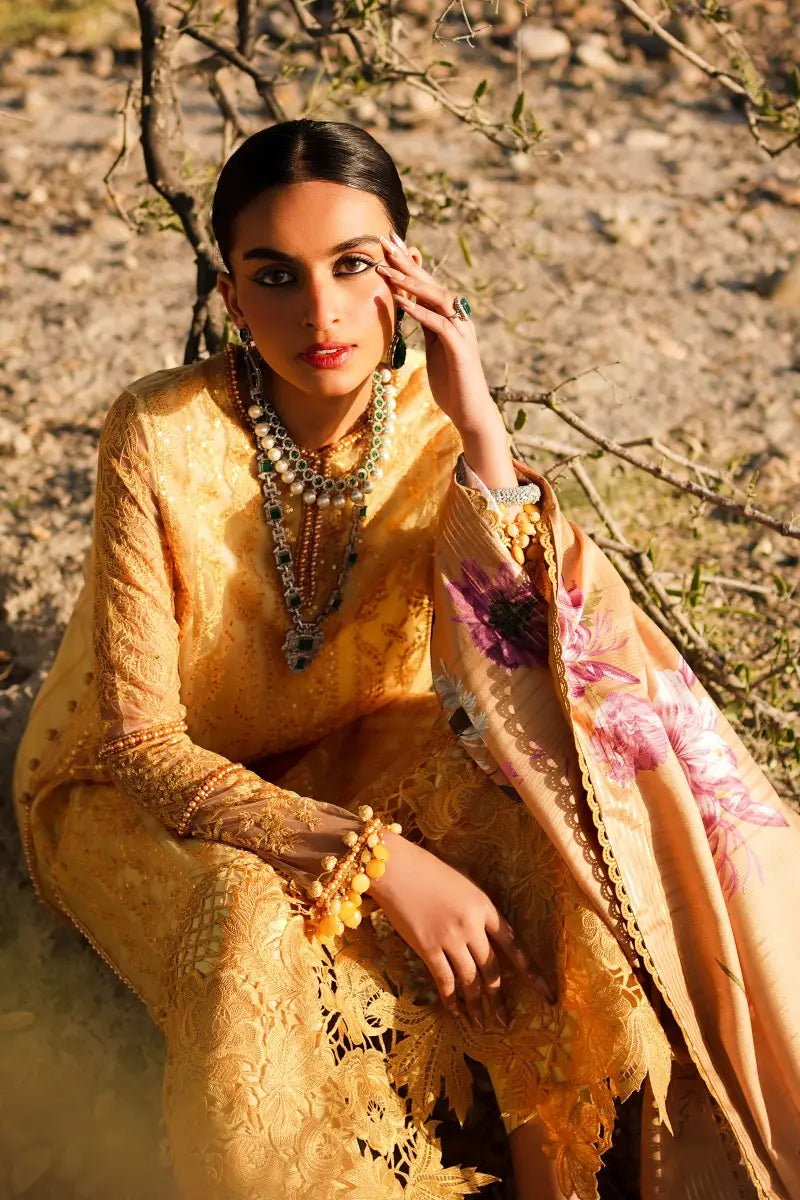Suffused with the spirit of the golden hour, this ochre hued silhouette is an eclectic mix of floral print and embroidered lace style patterns.