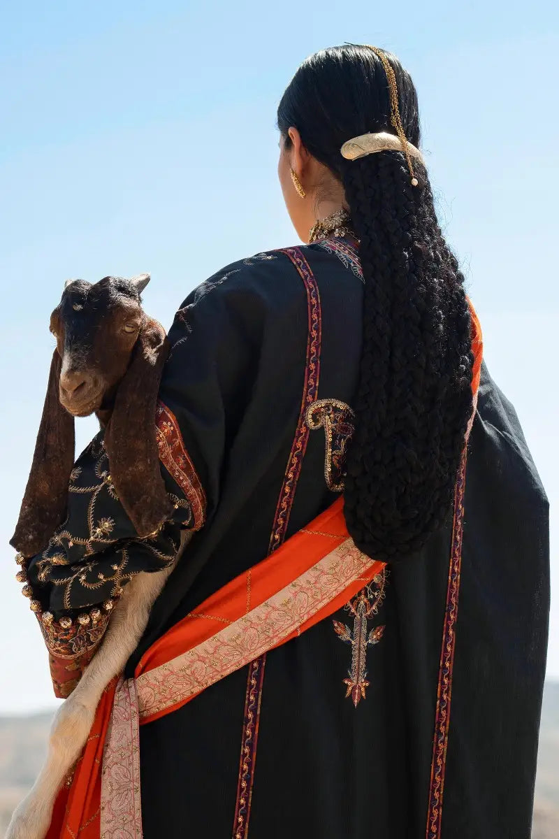 A silhouette accentuating an array of feminine embroidery, paired with a raw silk shawl and digitally printed pants that seamlessly blend customary art with modern perspective.