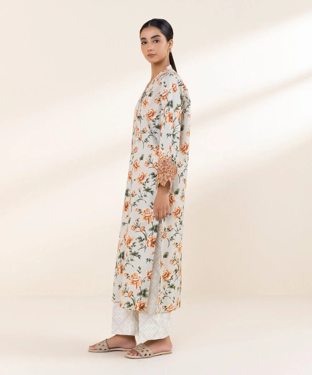 Make a floral statement with our two-piece embroidered ensemble in silver birch featuring a lawn shirt and cotton trousers.