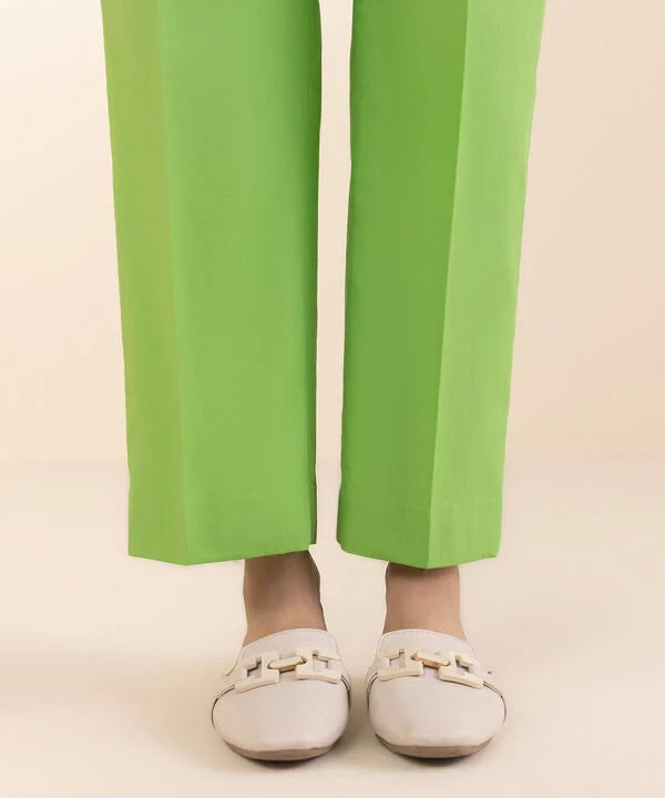 Make a statement with our three-piece embroidered ensemble featuring a cotton shirt and dyed trousers in green paired with a maroon pink voile dupatta.