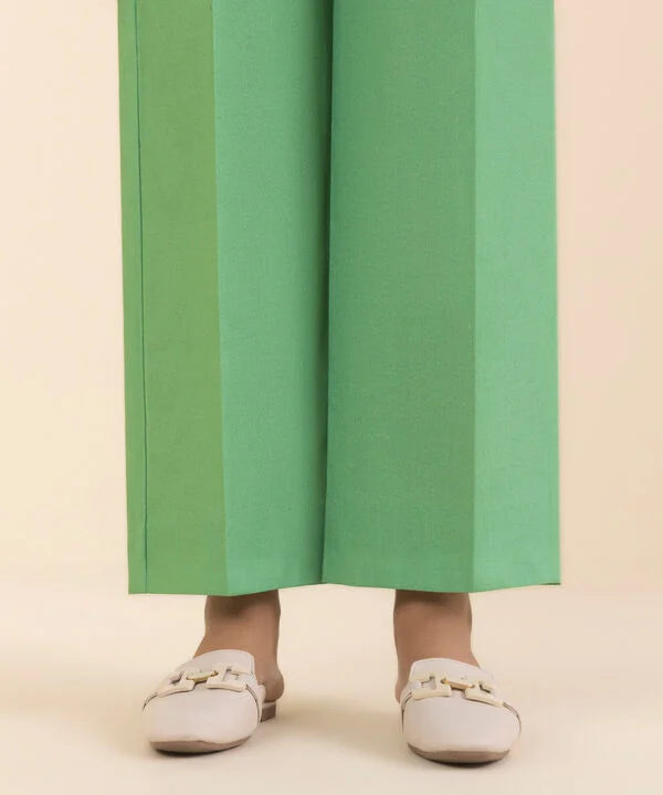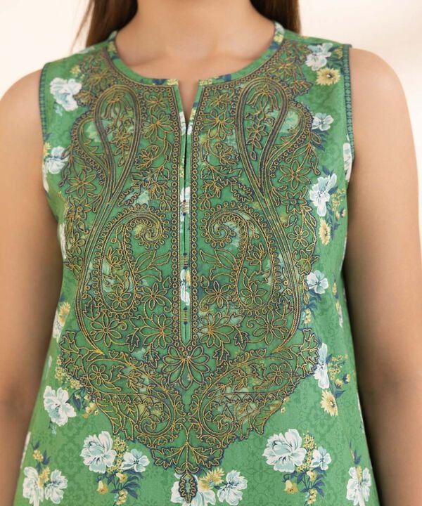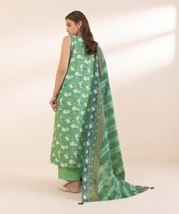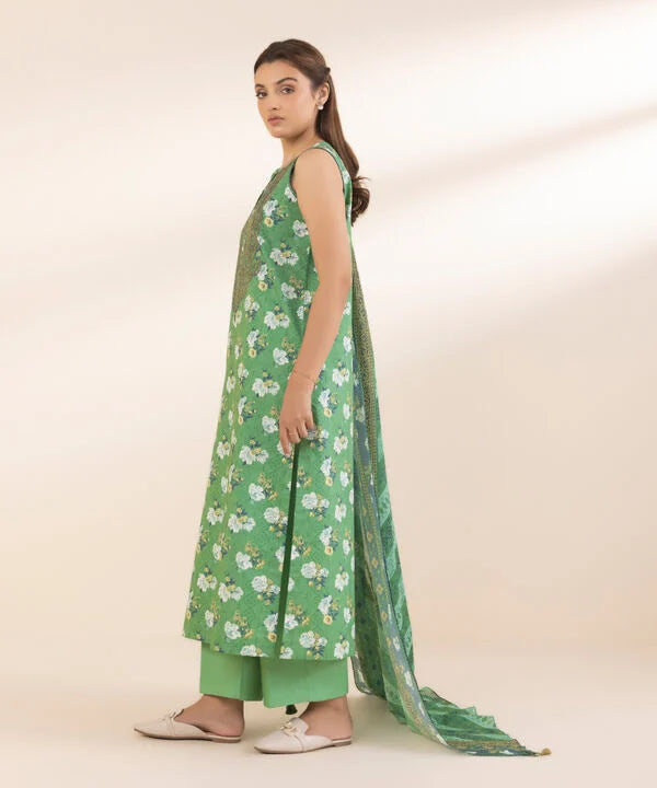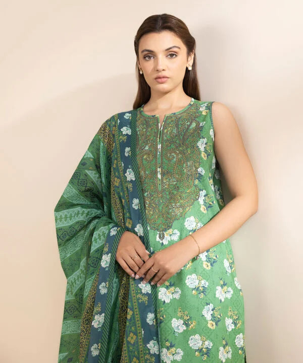 Make a statement with our three-piece embroidered ensemble in apple green featuring a cotton shirt and dyed trousers paired with a voile dupatta.