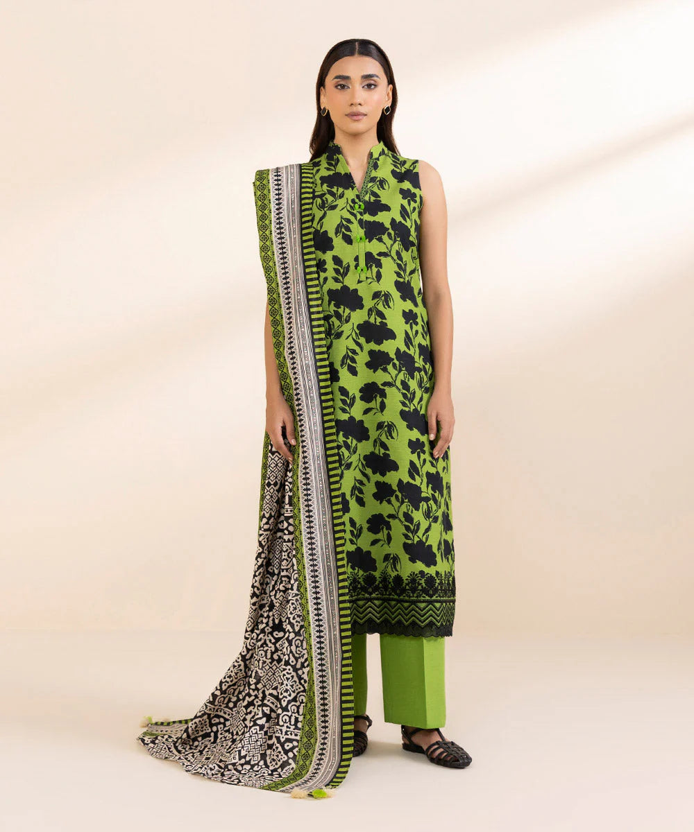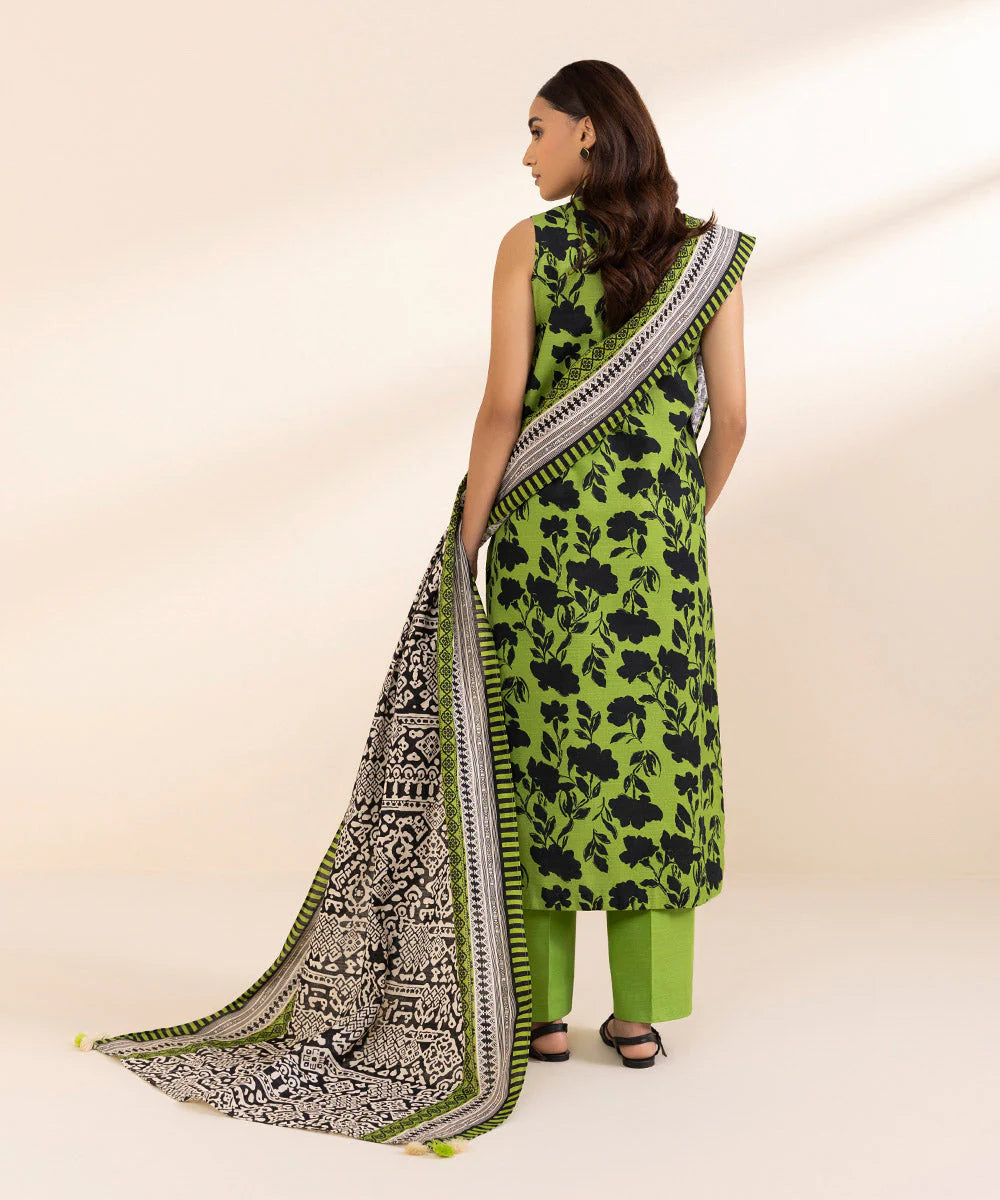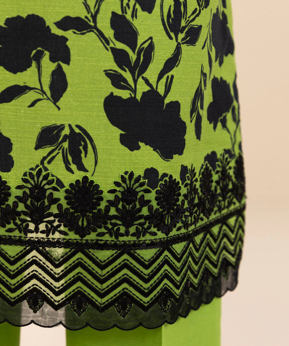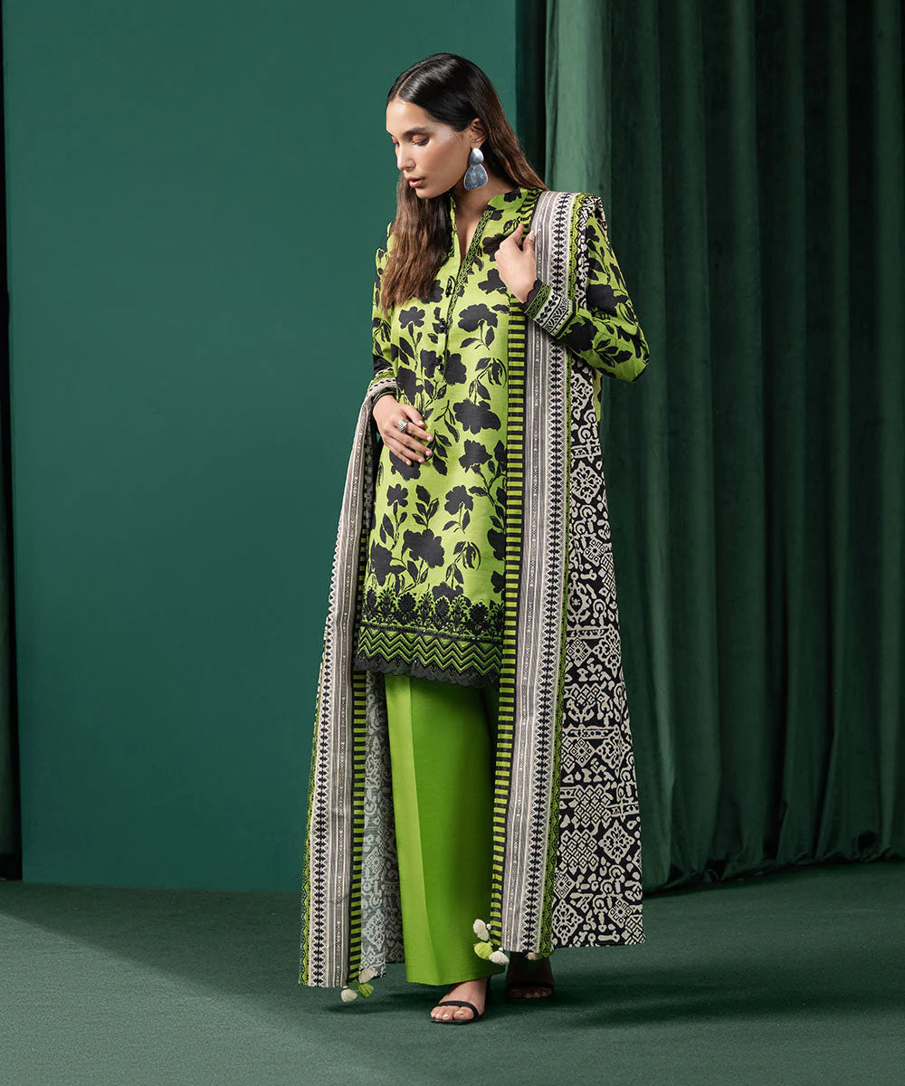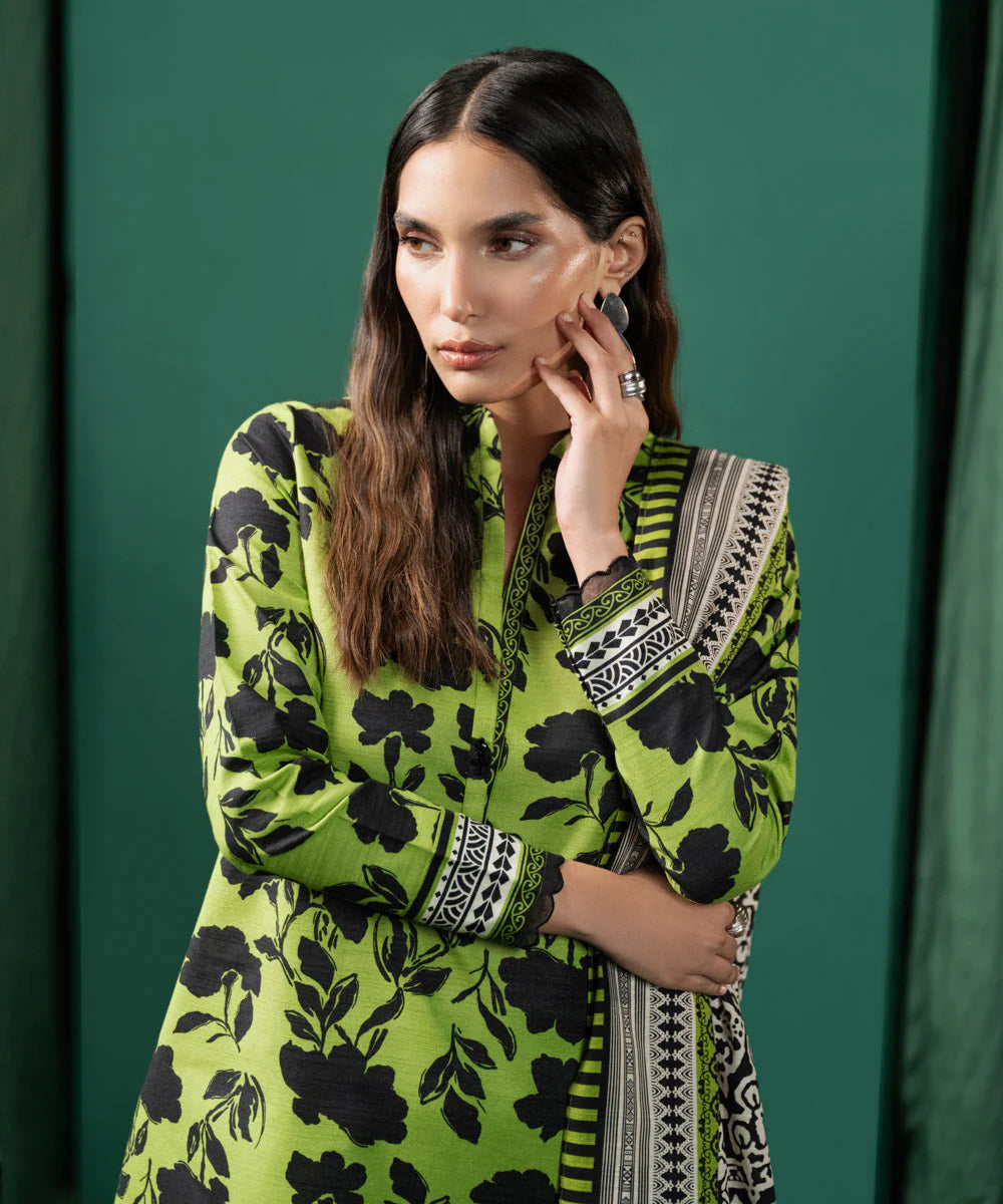 Make a statement this winter in our three-piece embroidered, apple green, and black khaddar suit with a black and off-white dupatta.