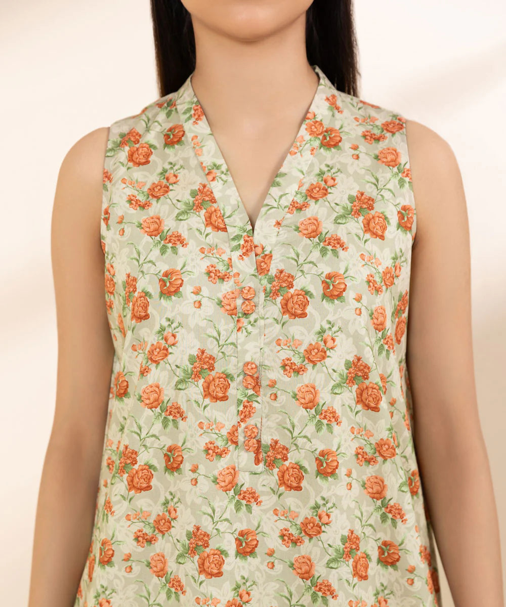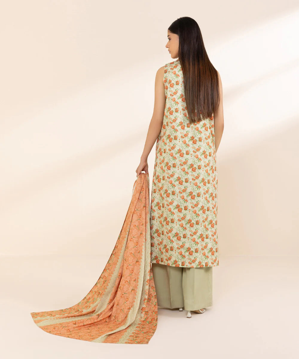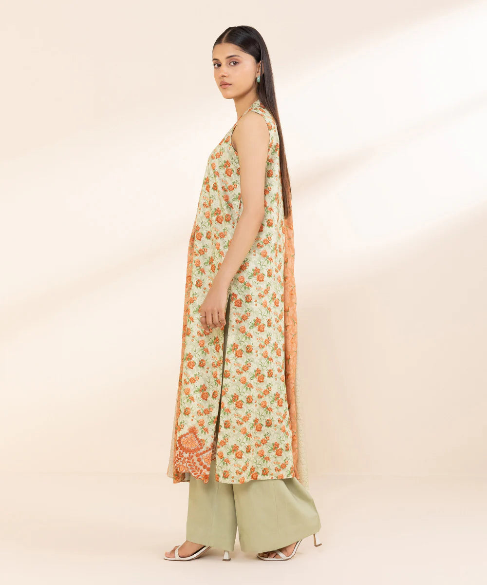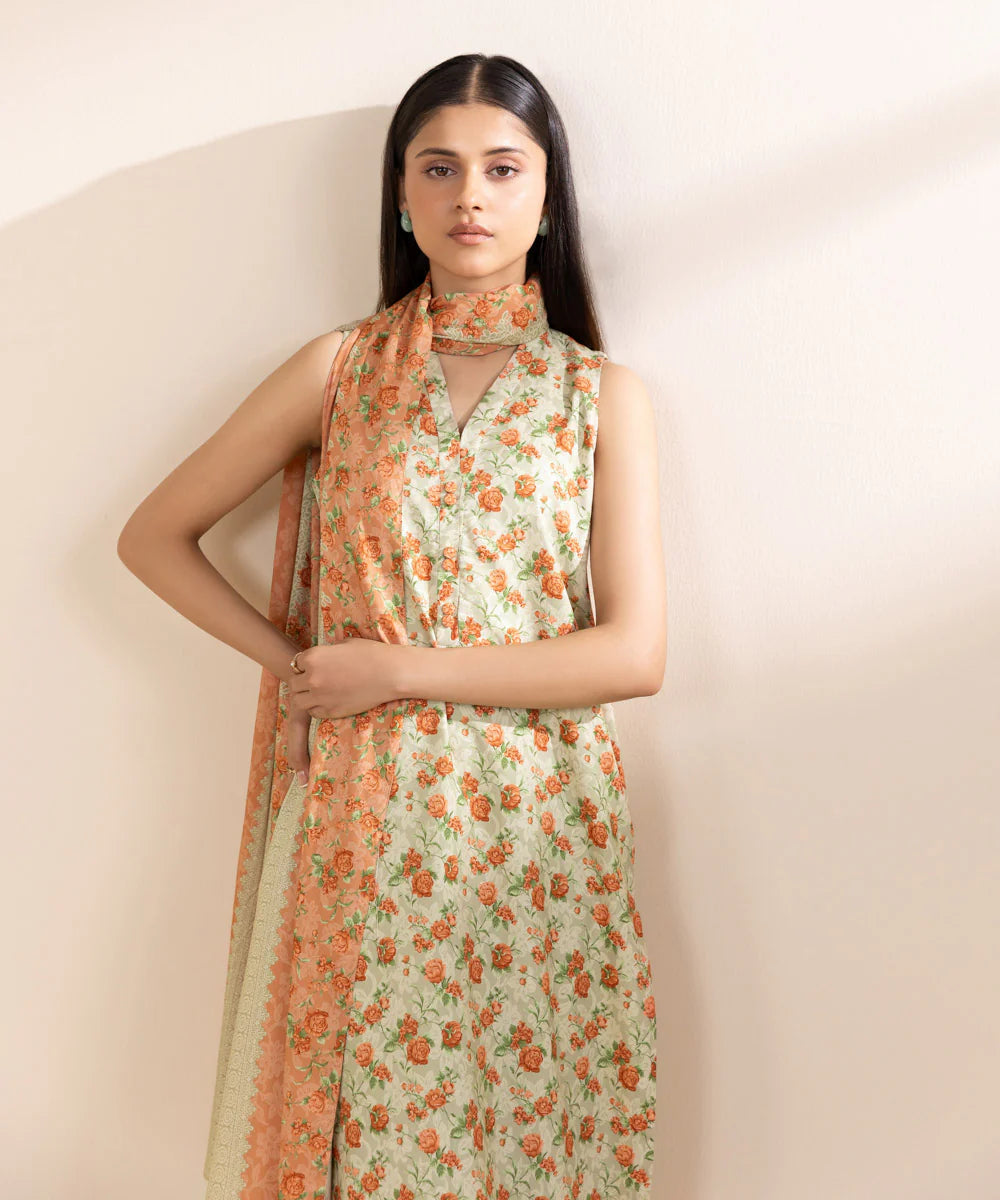 Make a standout statement with our beige and orange , three-piece embroidered linen ensemble illustrated with floral designs.