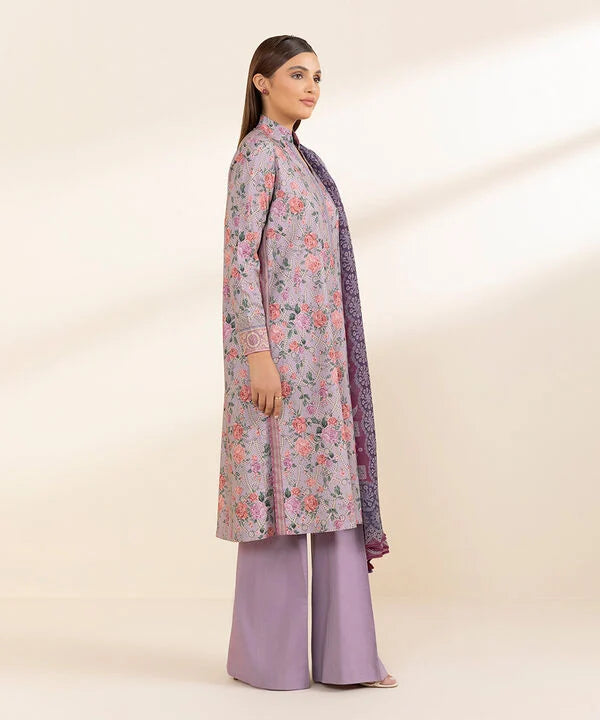 Elevate your style with our three-piece printed ensemble in lilac featuring a cotton viscose shirt and trousers paired with a matching blended chiffon dupatta.