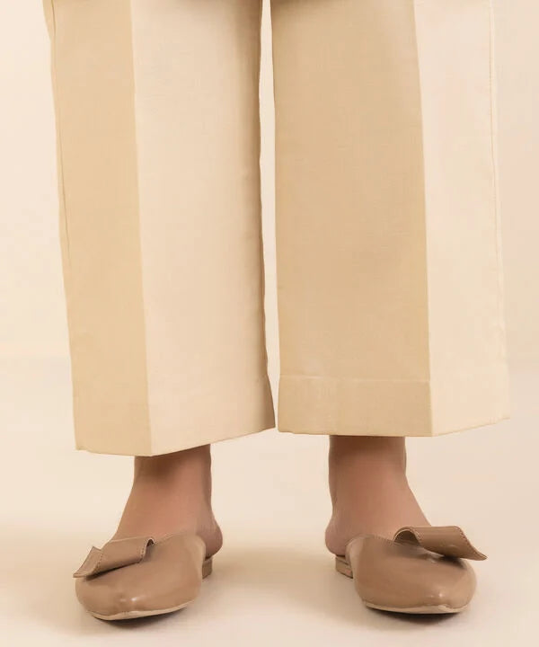Refresh your wardrobe with our three-piece printed ensemble in purple featuring a lawn shirt, dyed beige cotton trousers and a multicoloured voile dupatta.