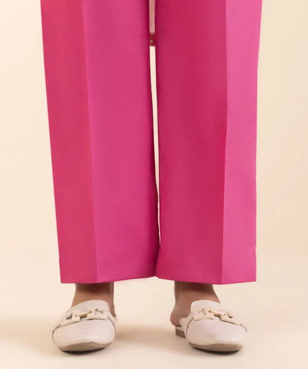 Refresh your wardrobe with our three-piece printed ensemble in shocking pink featuring a lawn shirt, dyed cotton trousers and a multicoloured voile dupatta.