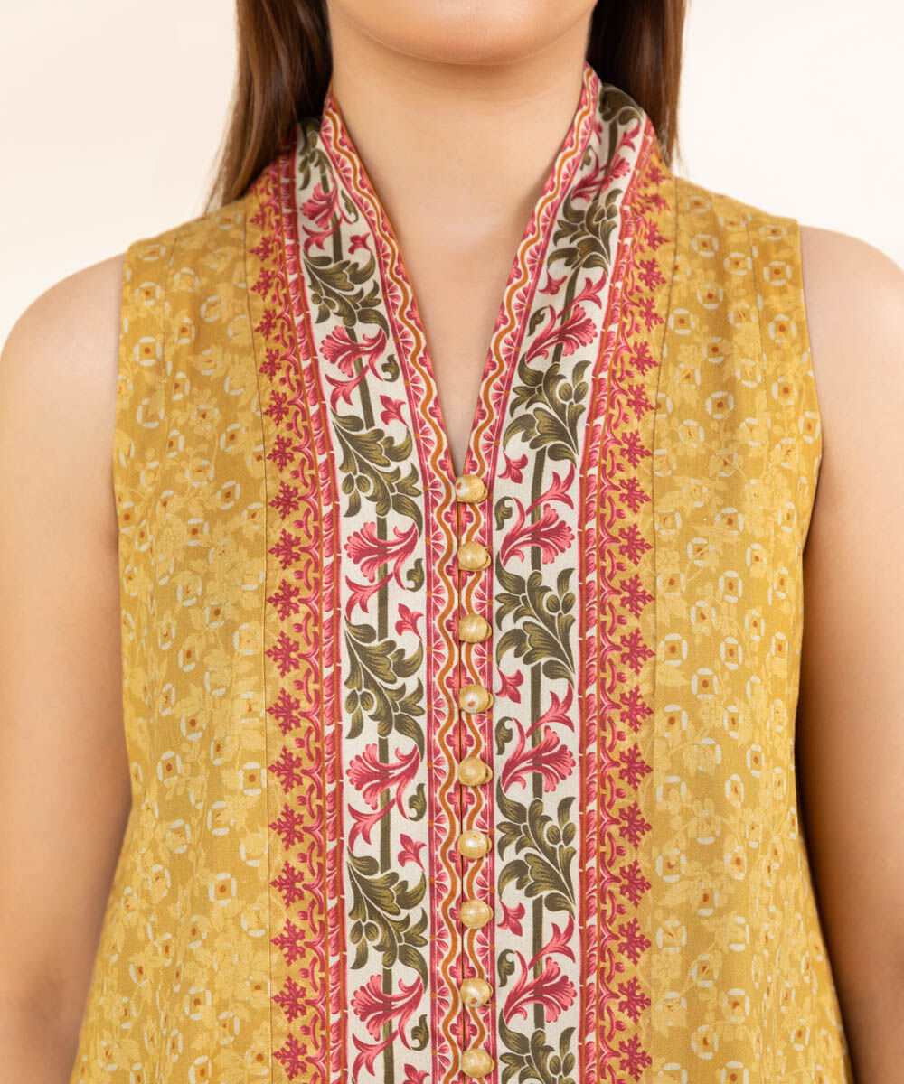 Elevate your style with our three-piece printed ensemble, featuring a mustard lawn shirt and cotton trousers paired with a blended tissue dupatta.