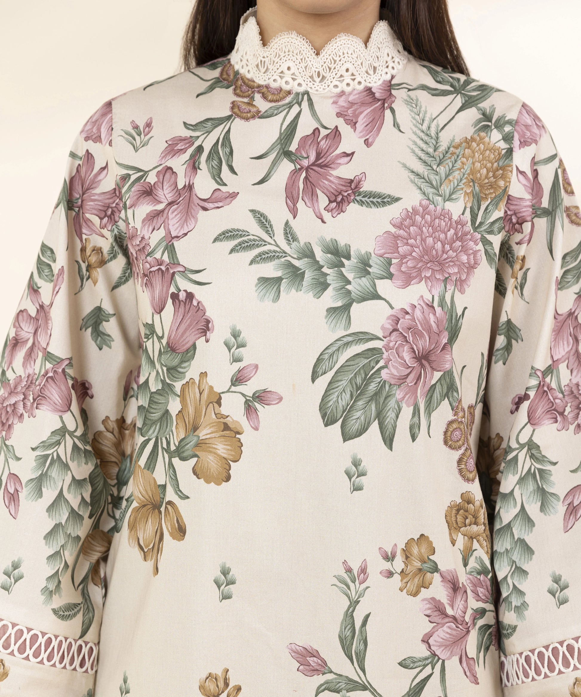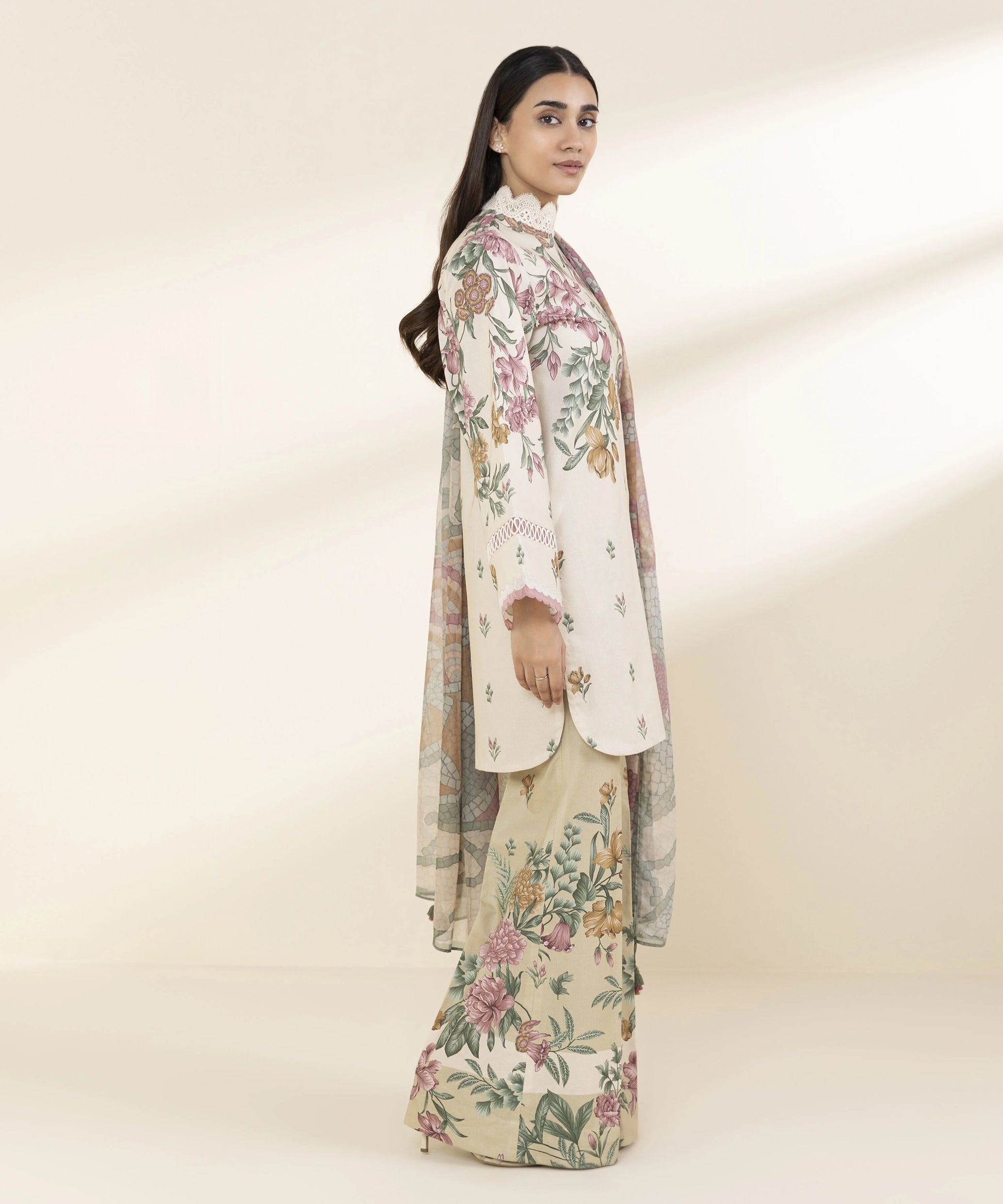 Step out in style in our printed off white lawn shirt and cotton trousers ensemble with a multi-coloured blended tissue dupatta.