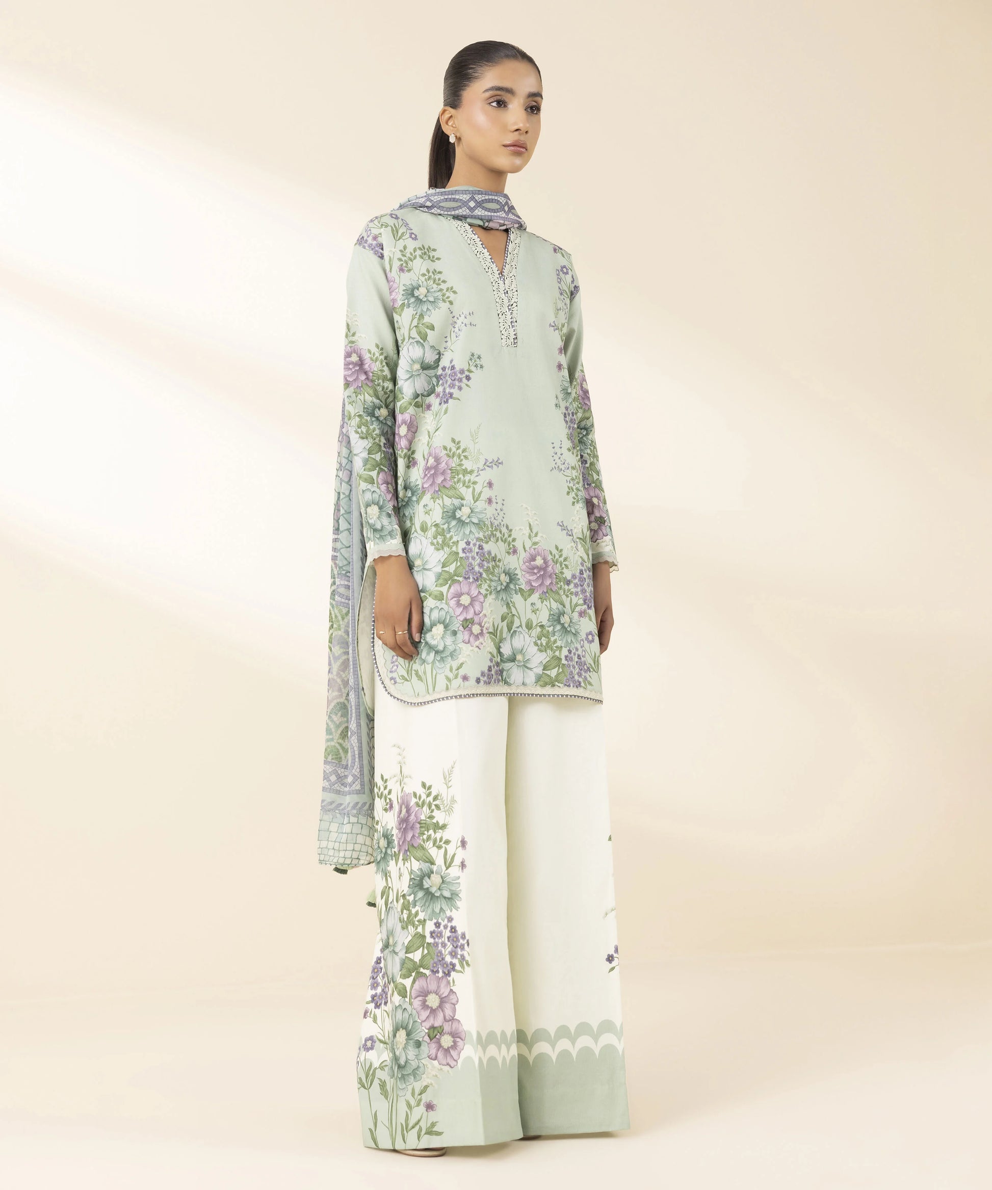 Step out in style in our printed light moss green lawn shirt and cotton trousers ensemble with a matching blended tissue dupatta.