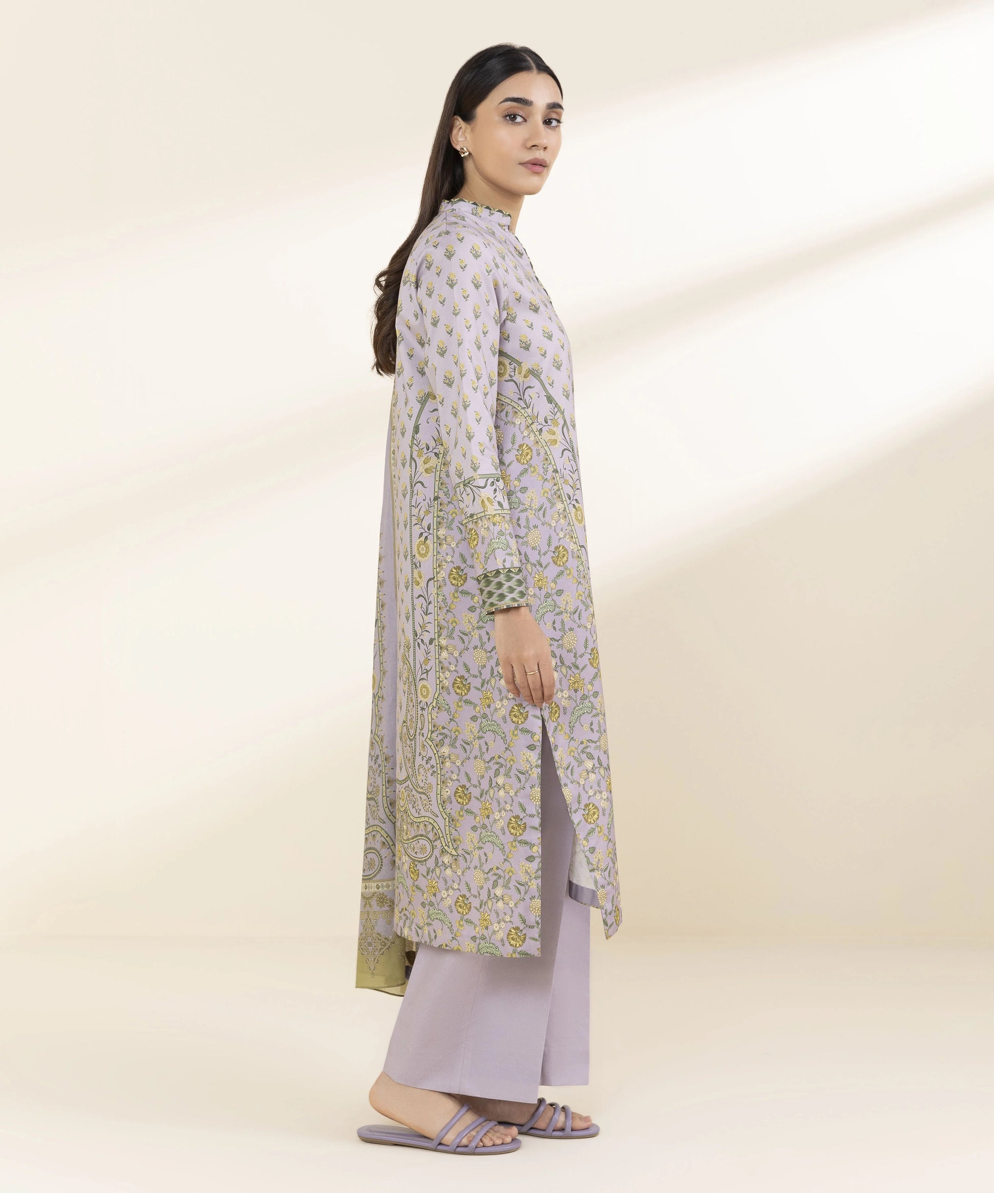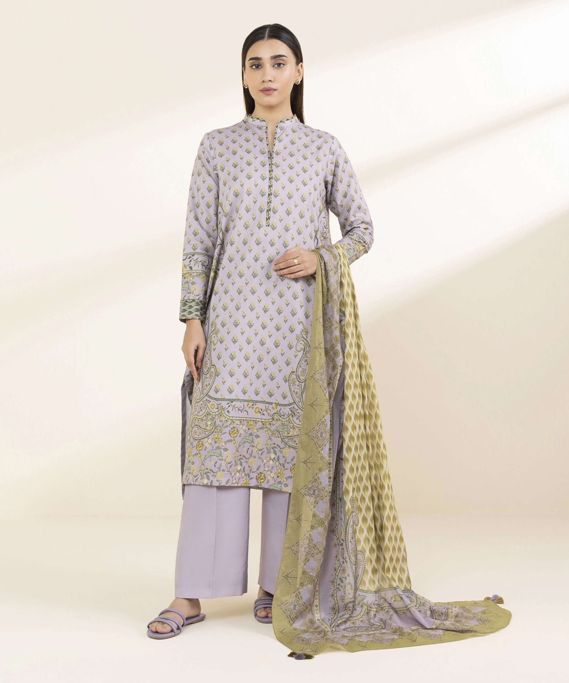 Step out in style in our printed lilac and yellow lawn shirt and cotton trousers ensemble with a matching voile dupatta.