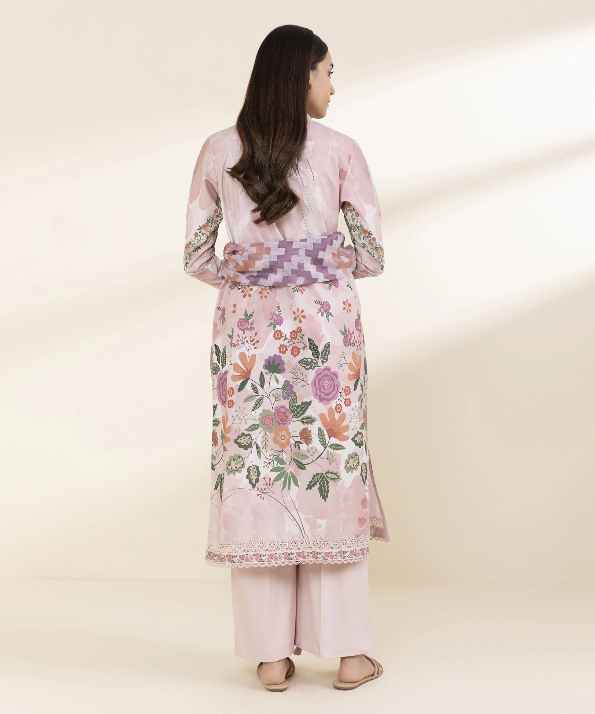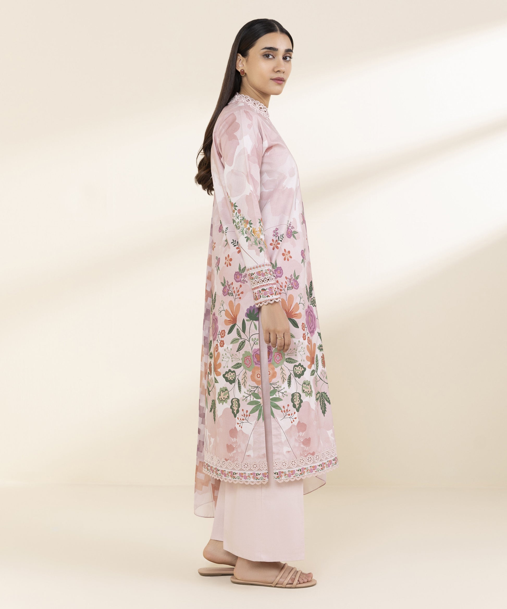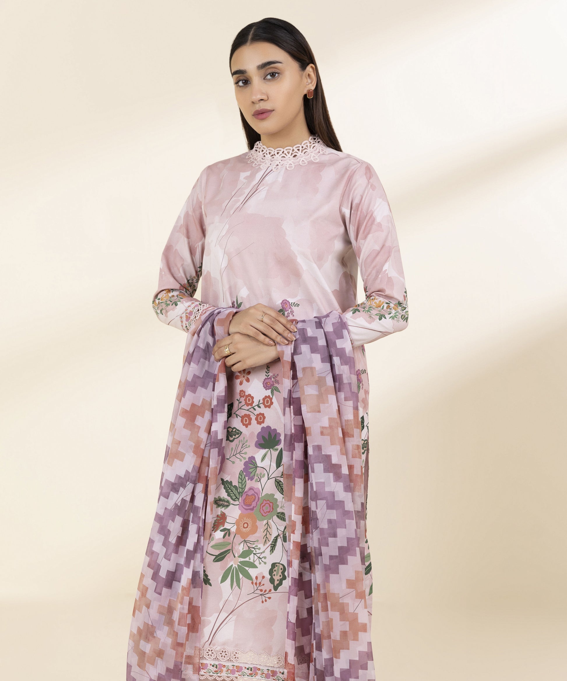 Step out in style in our printed pink lawn shirt and cotton trousers ensemble with a matching blended tissue dupatta.