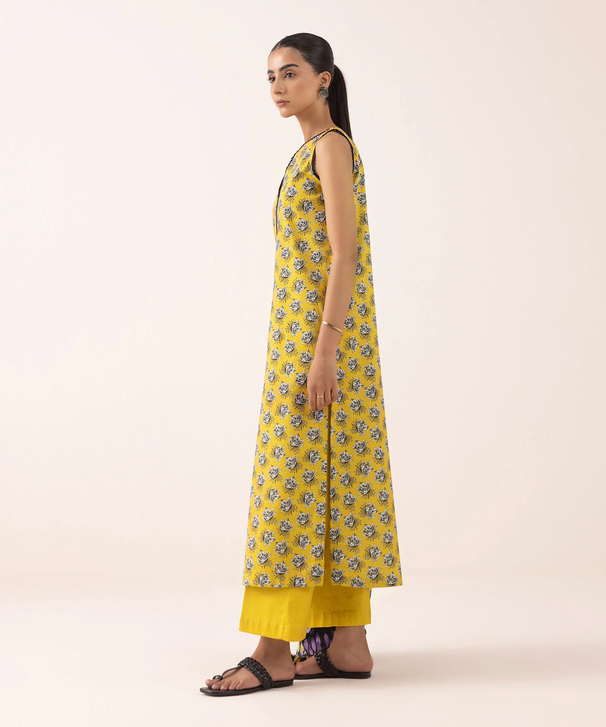 Make a statement with our three-piece printed yellow ensemble featuring a lawn shirt paired with a voile dupatta and dyed cotton trousers.