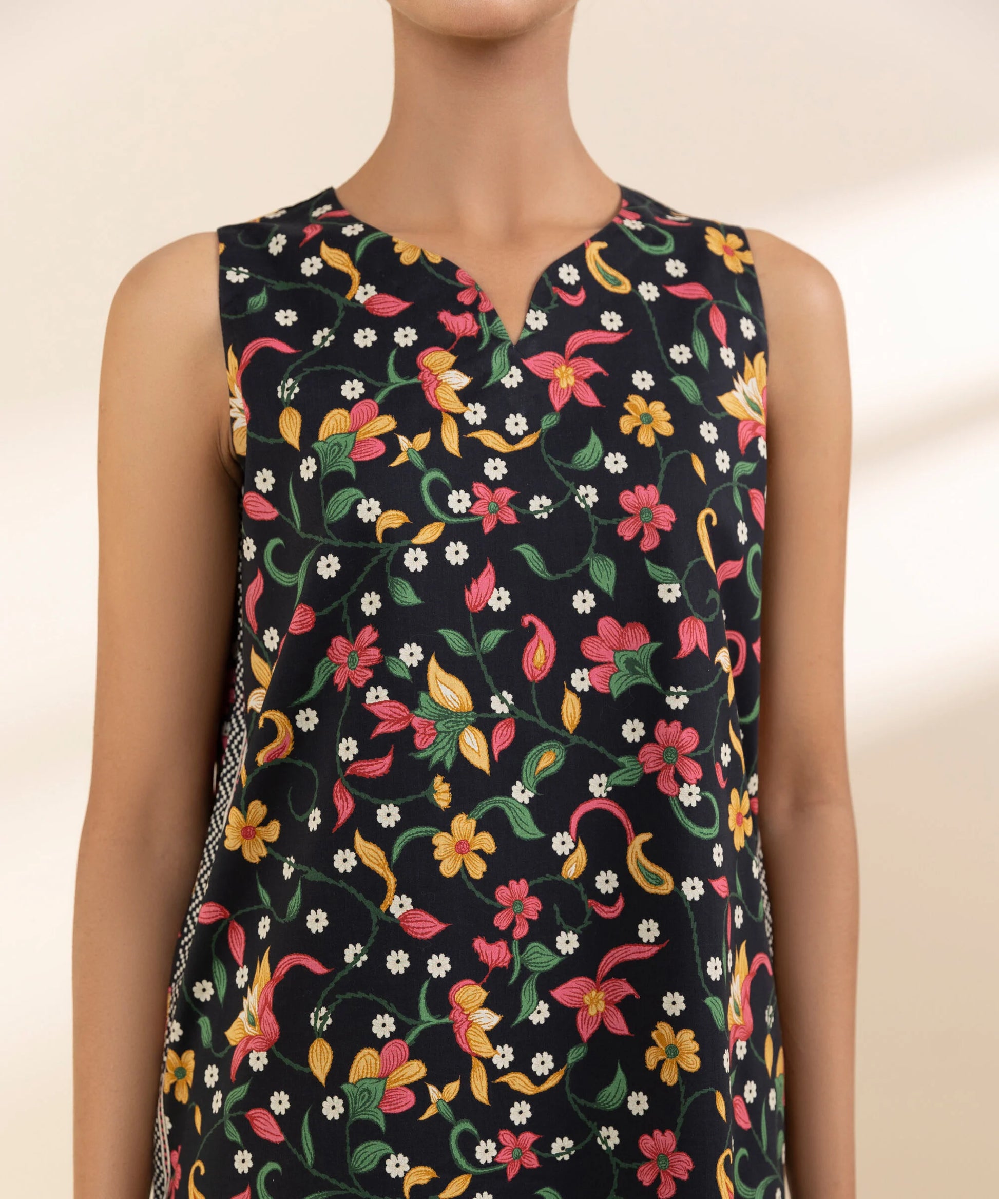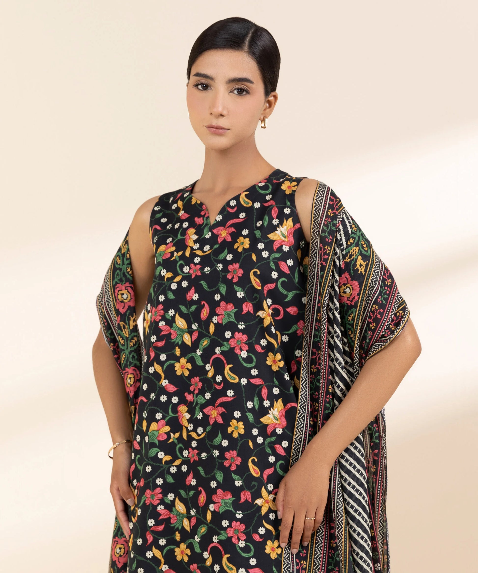 Make a statement with our three-piece printed ensemble featuring a multicoloured lawn shirt paired with a matching voile dupatta and dyed black cotton trousers.