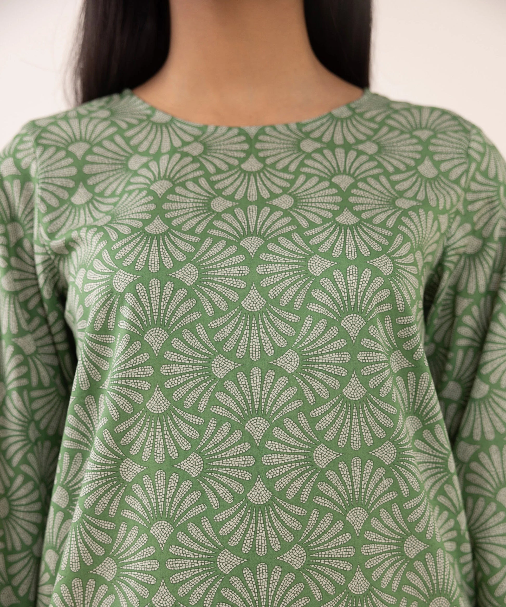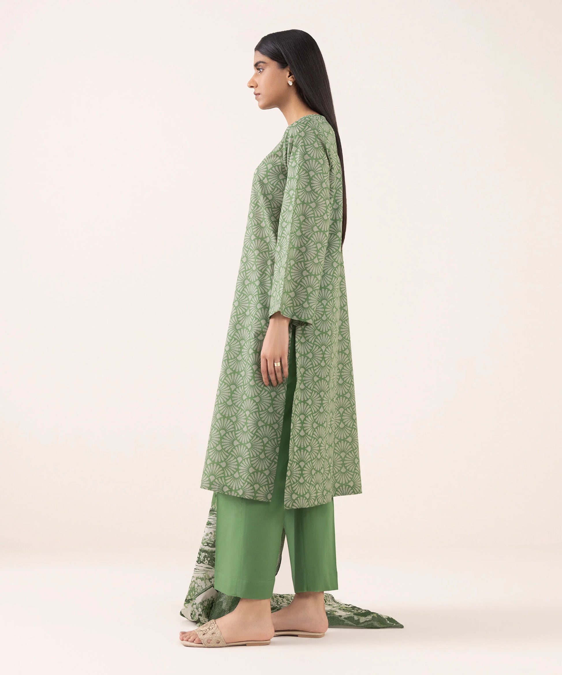 Make a statement with our three-piece printed ivory and green ensemble featuring a lawn shirt paired with a voile dupatta and dyed cotton trousers.