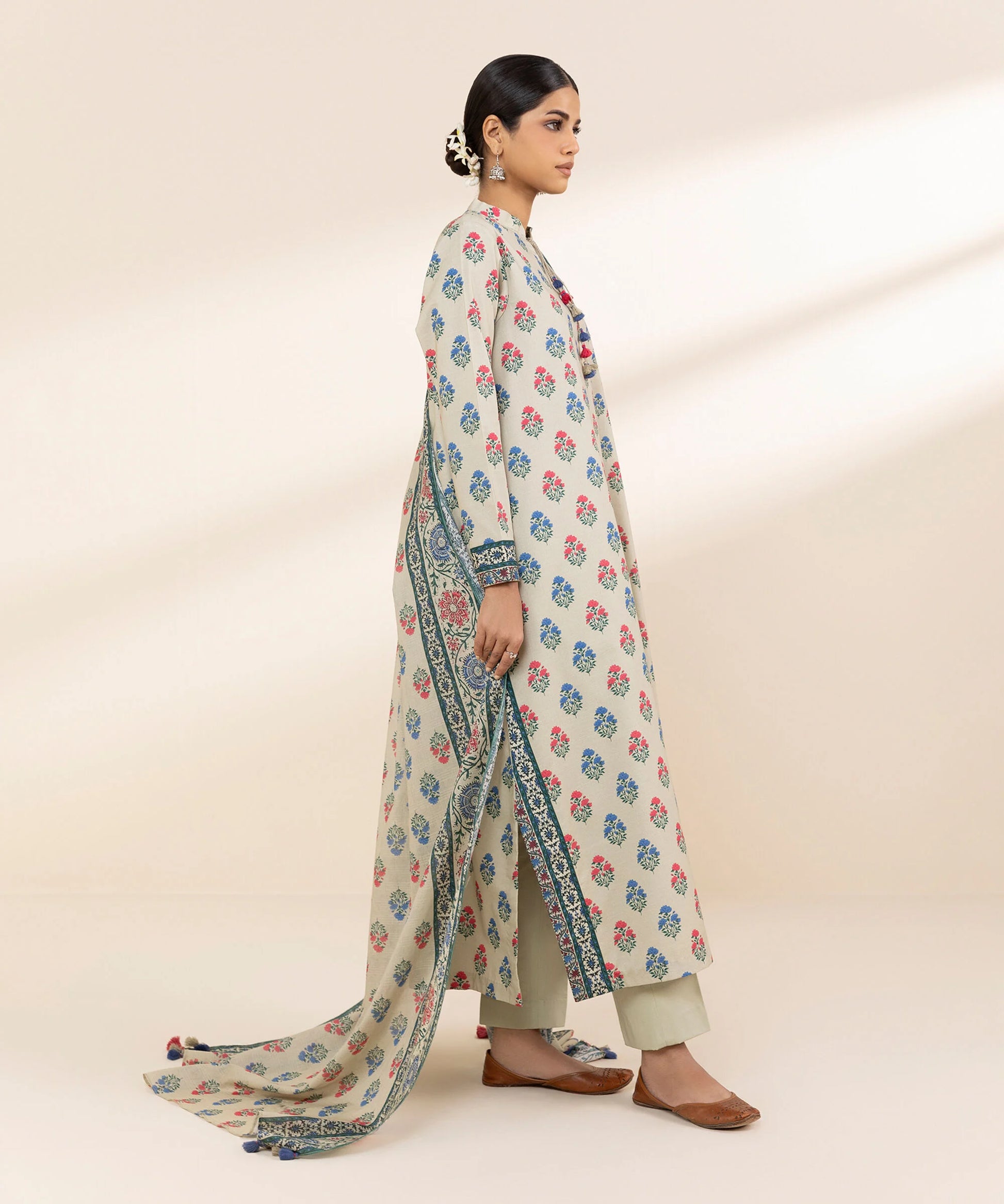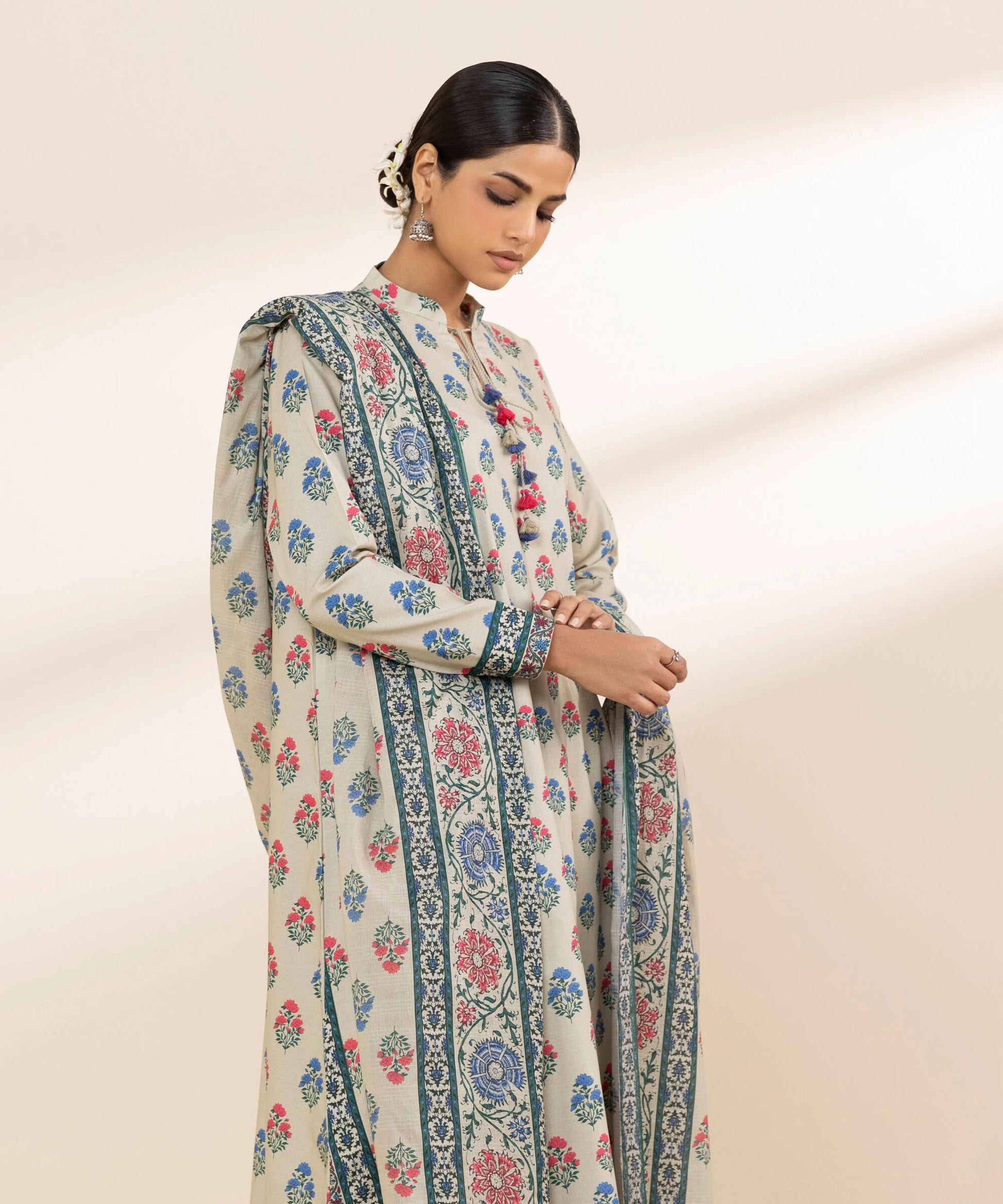 Make a statement with our three-piece printed ensemble featuring a multicoloured shirt and dupatta paired with dyed cotton trousers.