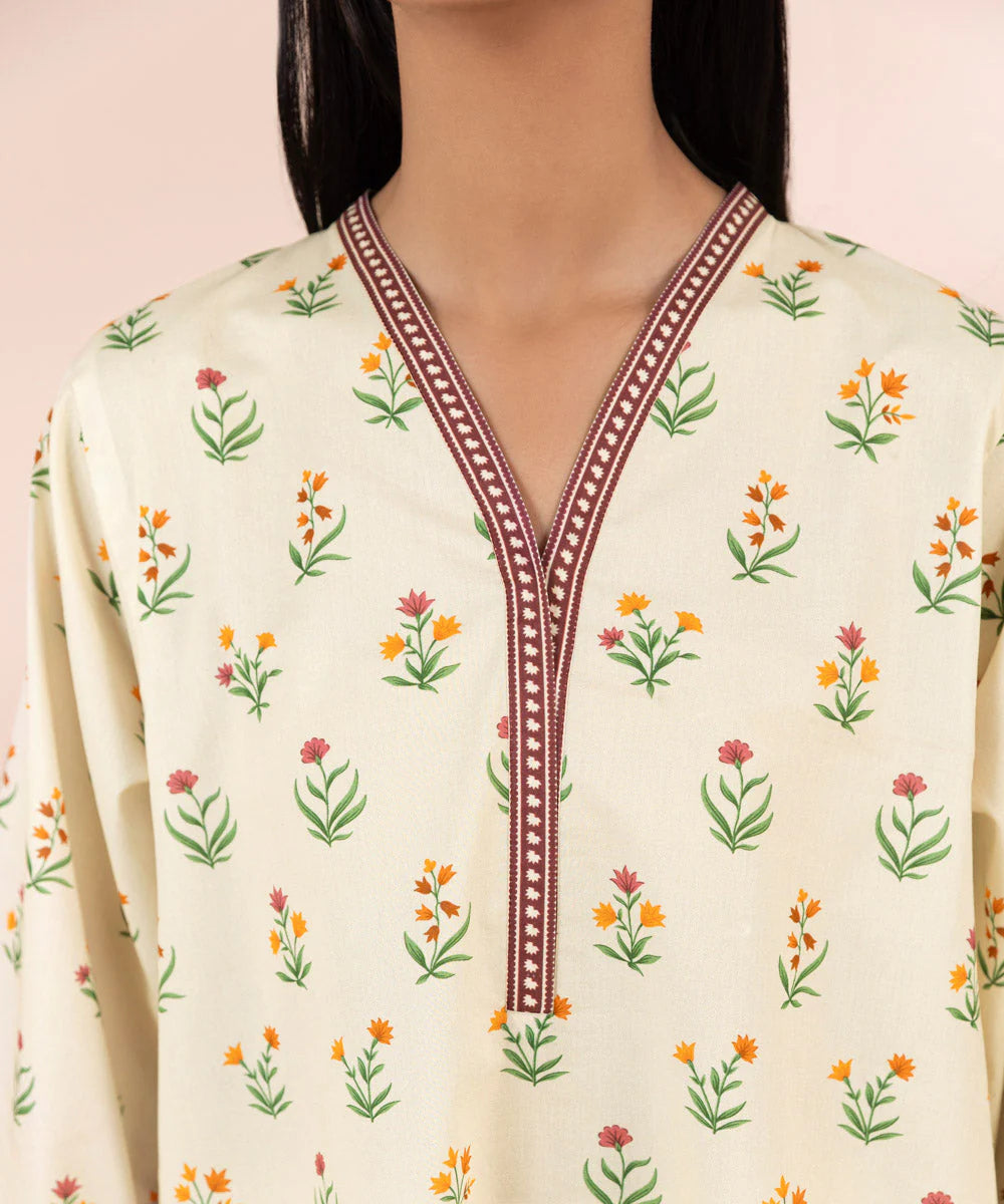 Immerse yourself in chic prints with our off-white printed three-piece featuring a lawn shirt, cambric trouser, and multi-coloured voile dupatta.
