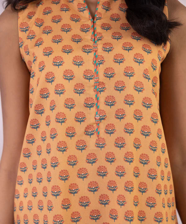 Immerse yourself in breezy designs this festive season with our three-piece yellow orange printed suit featuring a lawn shirt, blended chiffon dupatta, and cambric trouser.